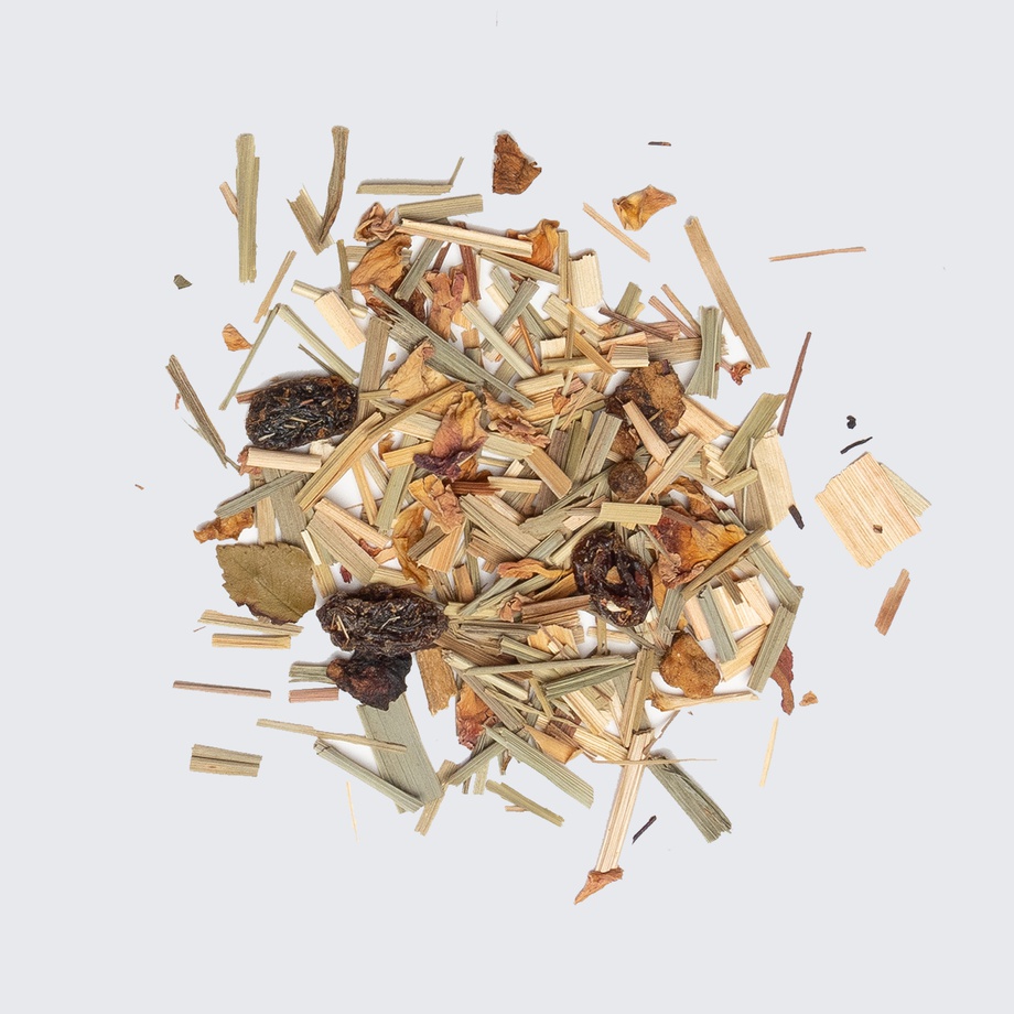 Lemongrass, apple, raisins, rose buds & petals, ashwagandha, chaga, orange peel, vanilla extract.