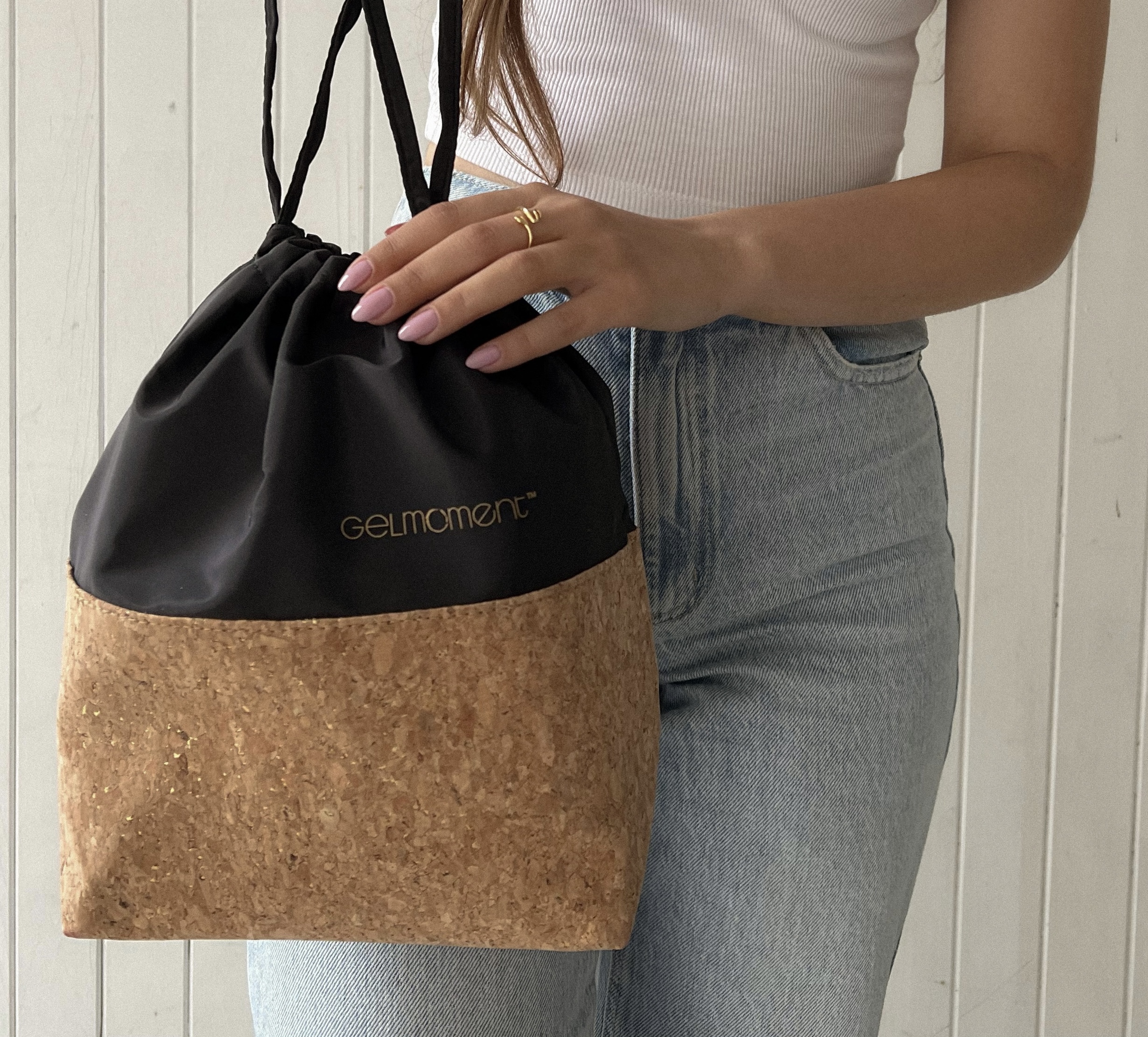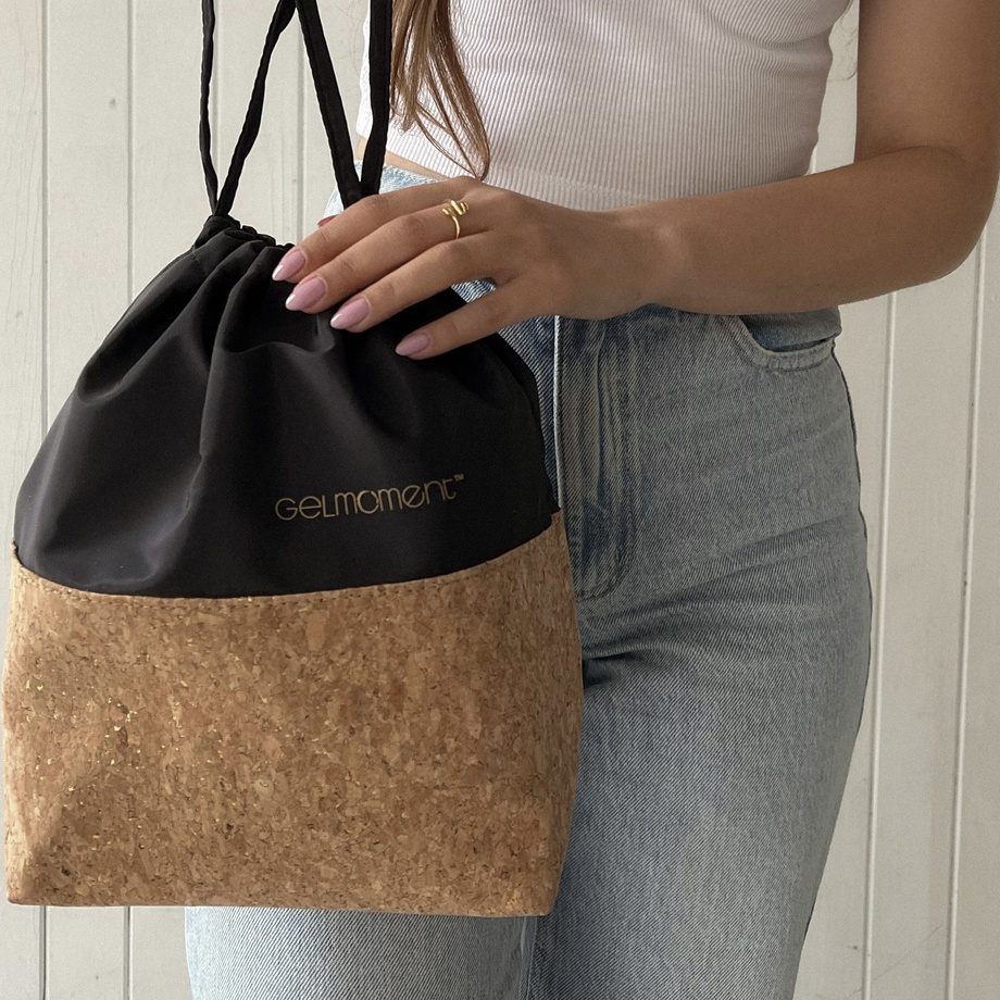 GelMoment’s Cork Drawstring Bag is as sturdy as it is stylish. Tote around your smaller essentials in this perfectly sized and uniquely designed drawstring bag. You have two colour schemes to choose from: cork base with multicolour speckles, pale pink vinyl upper body, and white GelMoment logo; or cork base with gold speckles, black vinyl upper body, and golden GelMoment logo.